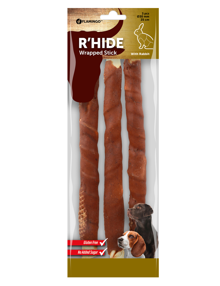 Flamingo Feinschmecker Kaustangen mit Kaninchen. Ein herrlicher Leckerbissen für Ihren Hund. Als Belohnung oder kleine Zwischenmahlzeit.